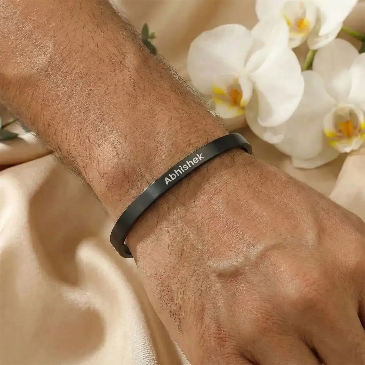 Black Personalized Engraved Name Bracelet, resting on a piece of textured wood. The bracelet is slightly curved, with a smooth, highly polished surface that reflects light beautifully. In the center, the name is engraved in a stylish, slightly italicized font. The engraving is deep enough to catch the light and create a visible shadow, making the name stand out prominently against the black background. The bracelet is quite wide, approximately the width of two fingers, and has slightly rounded edges for a comfortable fit.