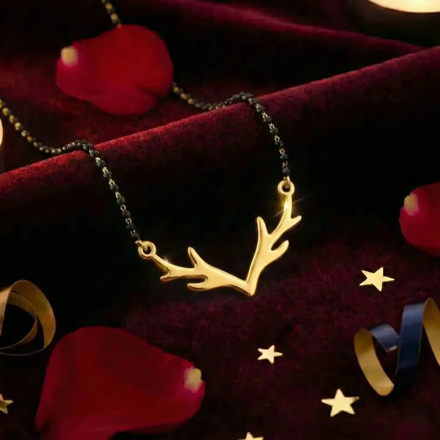 Make a bold statement with this unique deer antler necklace. The distinctive golden antler pendant, with its strong and elegant silhouette, is a conversation starter. The contrasting black bead chain adds a touch of traditional flair, making this necklace a standout accessory.