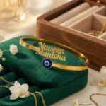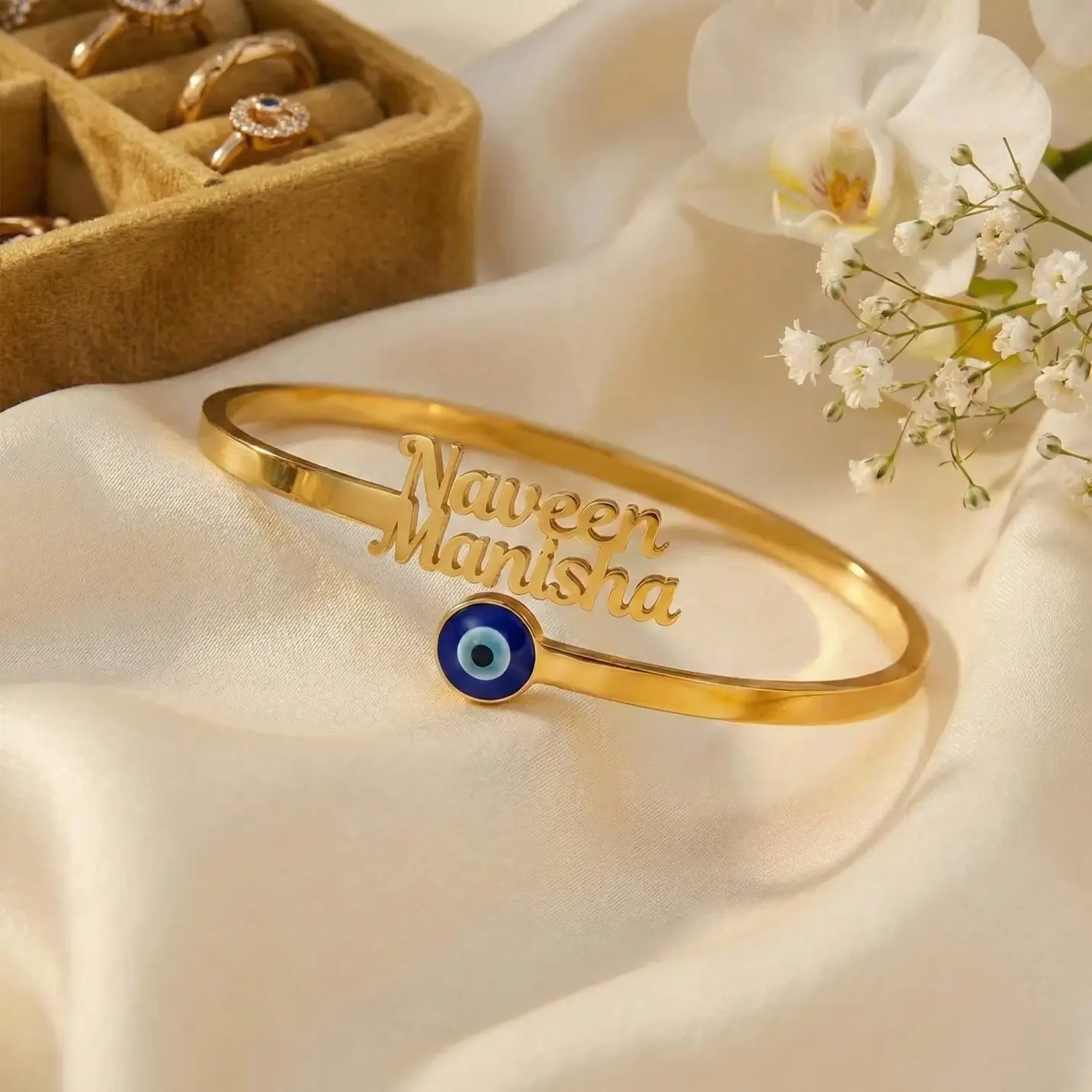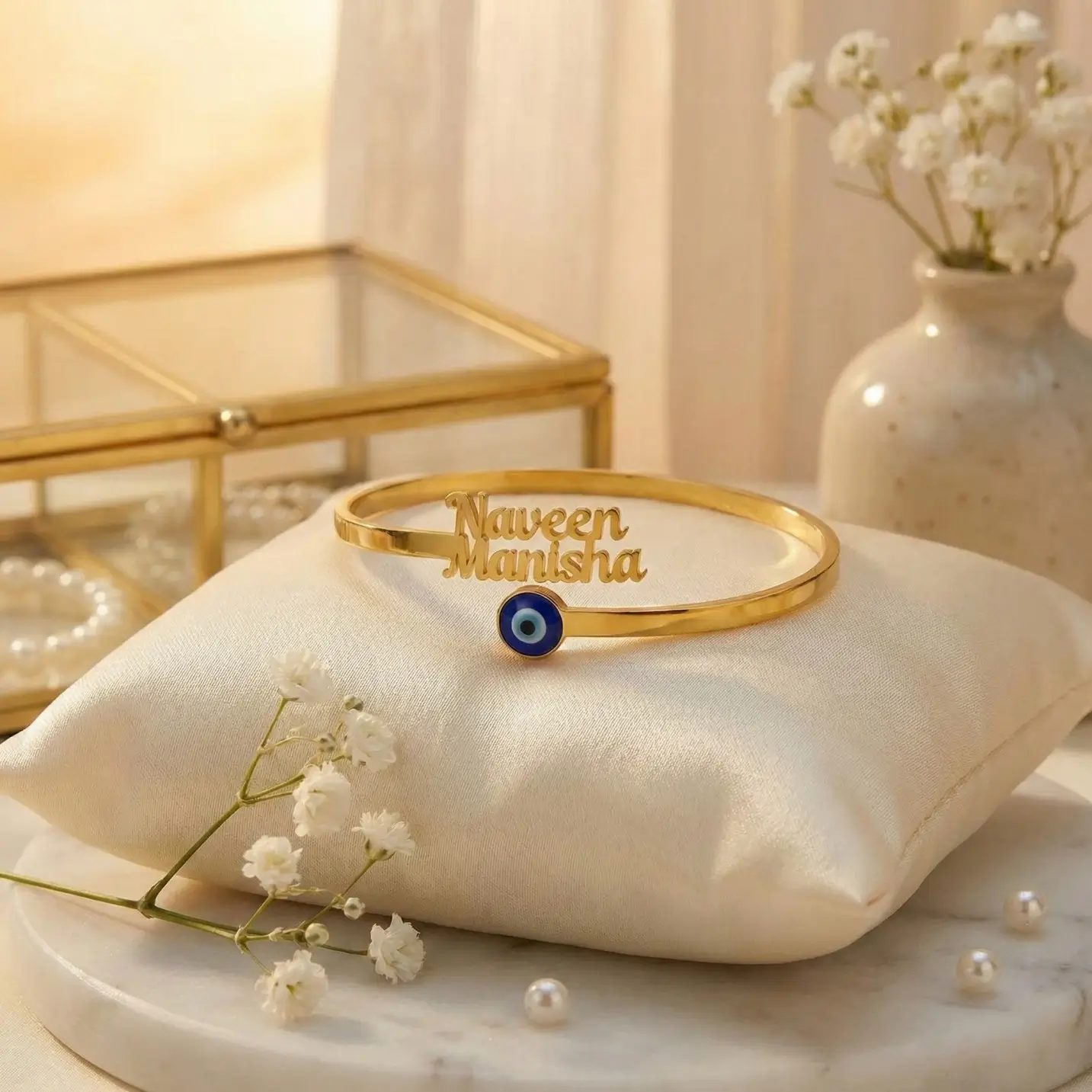 Celebrate love with our Evil Eye Couple Bracelet featuring two names elegantly connected with a heart design. Crafted with premium-quality metal and polished with a luxurious gold finish, this customized name kada is perfect for couples, anniversaries, and special gifts. Whether for your partner, spouse, or as a thoughtful present for any occasion, this bracelet adds a touch of elegance and sentimentality to your style.