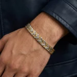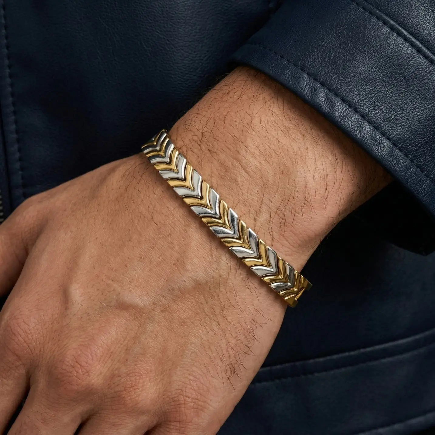 Add a bold and classy touch to your look with this stylish gold and silver chevron bracelet for men. Designed for modern daily wear, this premium bracelet gives a sharp, masculine, and elegant appearance that pairs perfectly with casual outfits, office wear, party looks, and special occasions. Its unique dual-tone pattern makes it stand out instantly, giving your wrist a rich and fashionable finish.